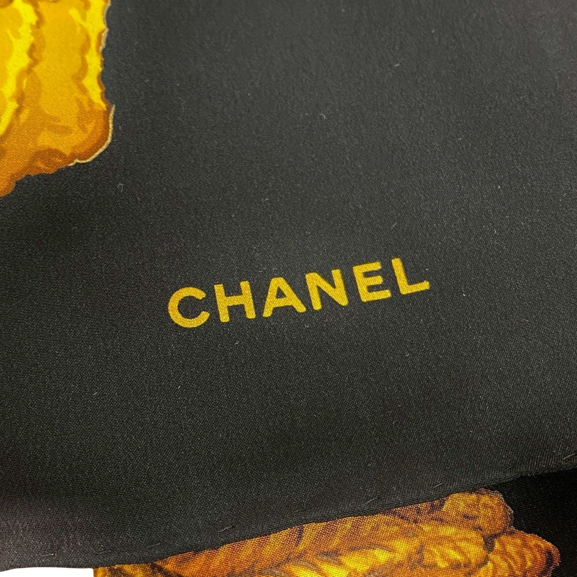 CHANEL Tassel Floral Print Coco Mark Silk Scarf Muffler for Women, Black and Gold, 16768