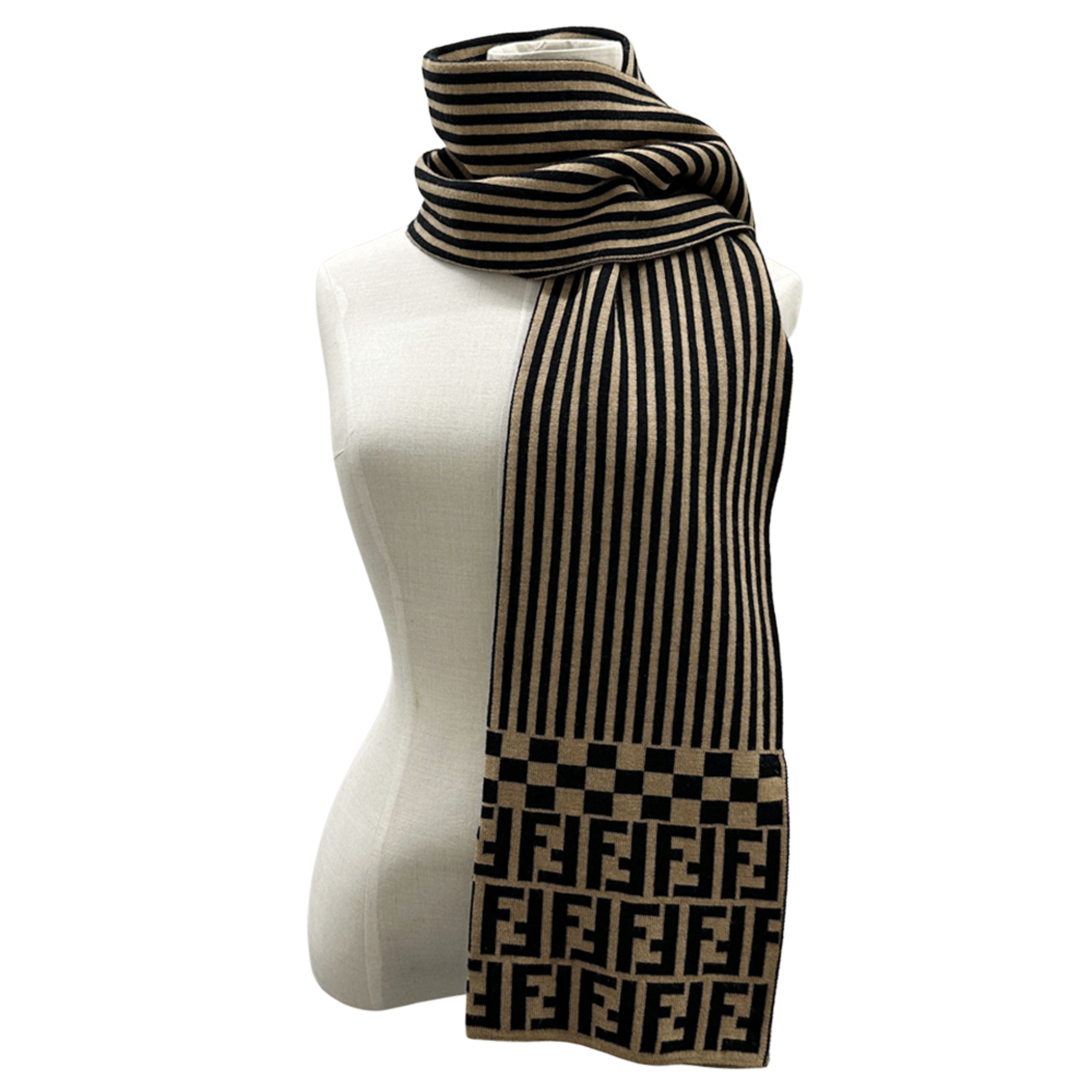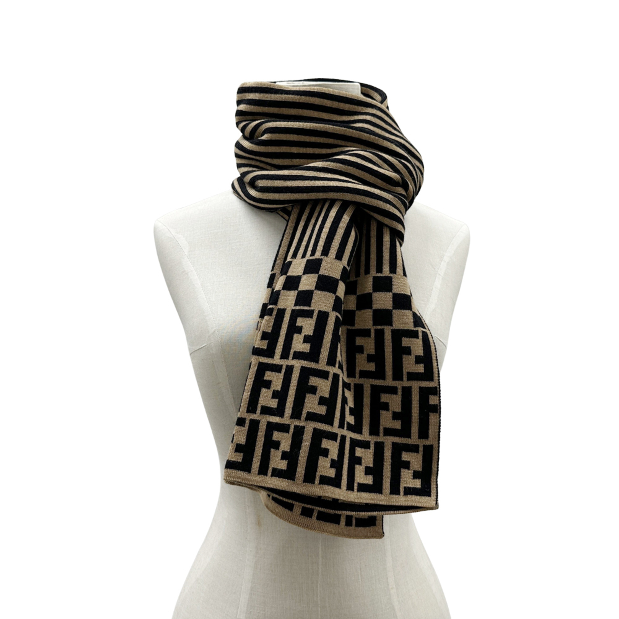 Fendi FENDI scarf for women and men, brand Zucca stole, wool, brown, black, logo, stripes