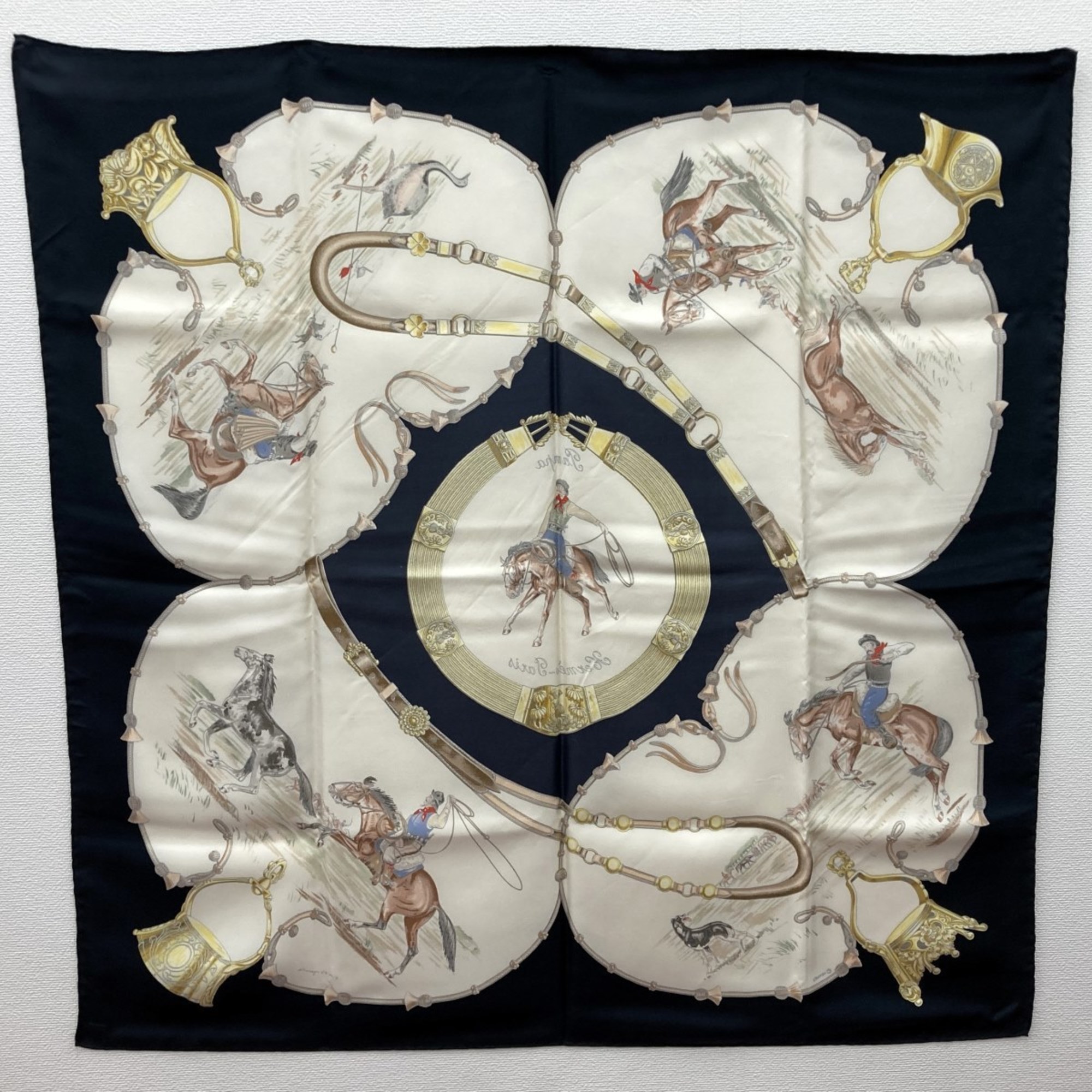 Be the first to review “HERMES Carré 90 PAMPA Prairie Jean de Fougerolle Scarf/Muffler with Horse Print, Black, Women’s”