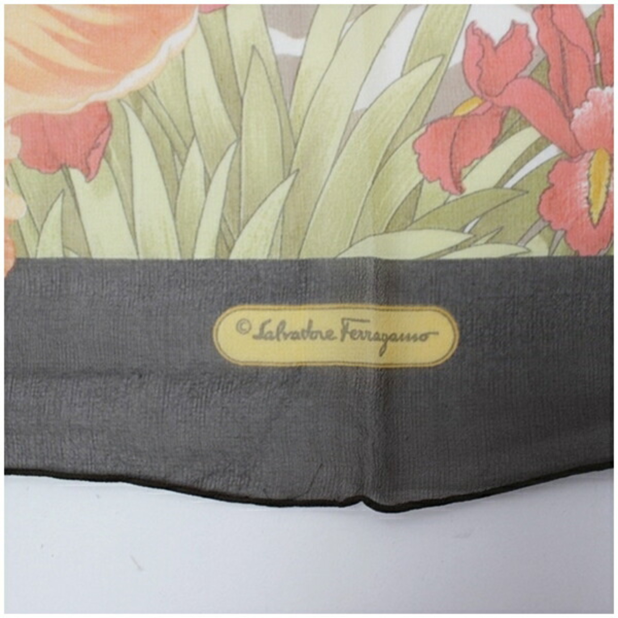 Be the first to review “Salvatore Ferragamo Women’s Unused Silk Rectangular Scarf in Gray and Orange”